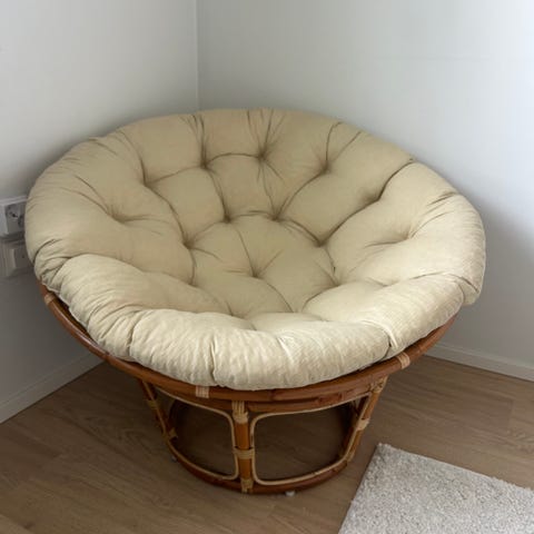 Rottinki osittain irronnut rakenteiden ympäriltä. Pehmuste hyvässä ja siistissä kunnossa, säilytyksessä mennyt hieman ryttyyn.