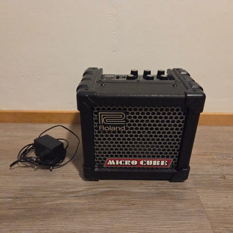 Roland Micro Cube kitaravahvistin. Kompakti ja kannettava malli, jossa useita säätimiä ja liitäntöjä. Sopii sähkökitaran vahvistamiseen ja harjoitteluun. Mukaan pedaali.