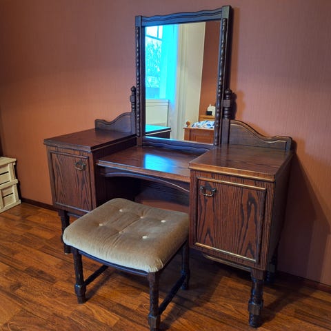 Upea pinnijalkainen kampauspöytä rulokaapeilla entisöintitaitoiselle. Kannessa käytön jälkiä ja viilut vahingoittuneet kaapeissa. Pinnijaloissa ruostepilkkuja.