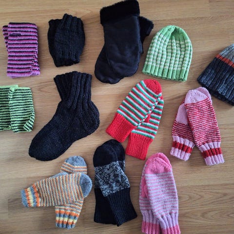 Kaksi paria kauniita käsin kudottuja Lapasia. Langan koostumus 75% villaa, 25% polyester. Toiset väriltään Tumman vihreä/punainen/valkoinen. Toiset puna-valkoiset. Lapaset ovat saman kokoisia. Ranne-lapasen kärki pituus 23,5 cm. Ranteen ympärys 16 cm. (joustaa) 10 e/kpl.
