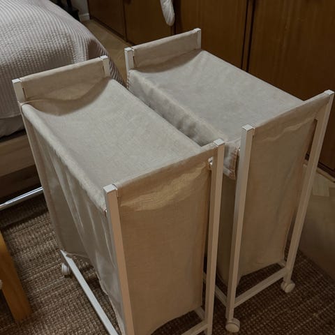 Erittäin kätevä pyykkikaappi pieneenkin tilaan. Koriin saa helposti viskattua suoraan oviaukosta likaiset pyykit ja samalla eriteltyä esim. mustat ja valkoiset.
