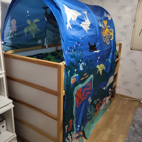 Myydään parvisänky (Ikea Storå tai nukkumatti), jossa pöytälevy ja hyllyt.