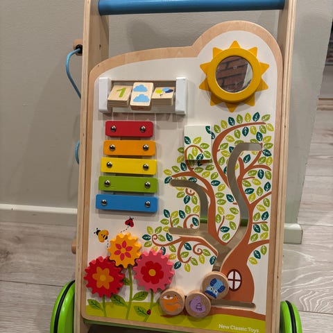 Micki taaperokärry sinisenä. Valmistettu puusta ja metallista. Sopii lasten leikkeihin ja kävelyn harjoitteluun.