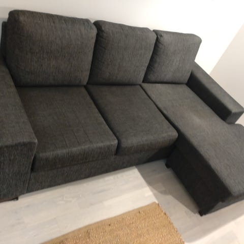 Hyvä kuntoinen sohva muuton tieltä. Pientä nukkaa jossain tyynyissä.