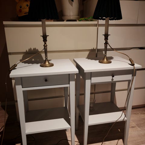 Jotex Williston yöpöydät 2kpl, seinään kiinnitettävät. Uudelleen käsitelty petsilakalla, joitakin epätasaisuuksia pinnassa on, muuten hyväkuntoiset pöydät.