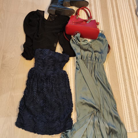 Kaksi kassillista (Ikean iso kassi + kaupan kestokassi) naisten vaatteita, pääosin s ja m kokoa. Muutama xs tai L saattaa olla mukana.