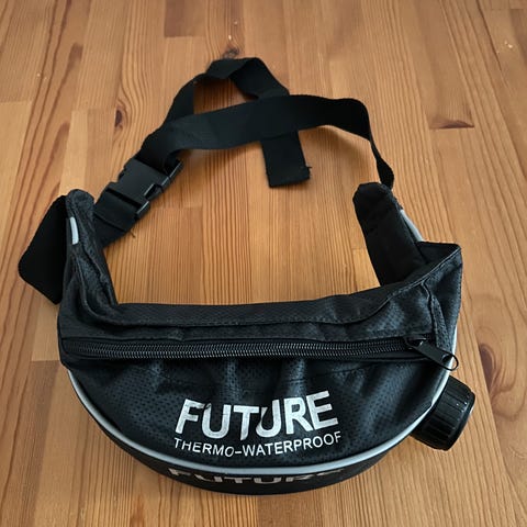 Myydään musta vyötärölaukku viidellä taskulla ja kahdella patch-kiinnityksellä.
