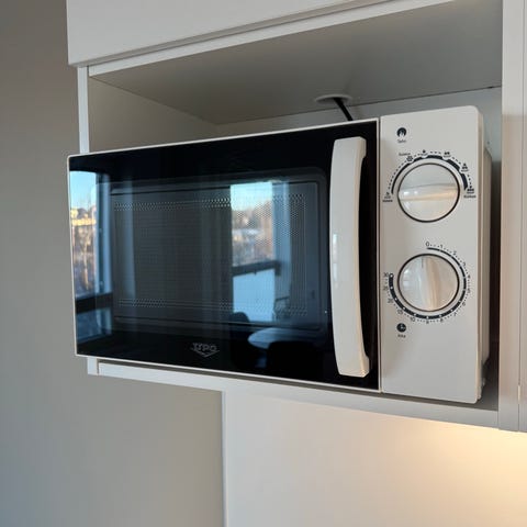Mikrossa on selkeät painikkeet ja pyöritettävä säädin, jolla käyttö on vaivatonta. Sisätila on puhdas ja lasinen pyöritysalusta on tallessa.