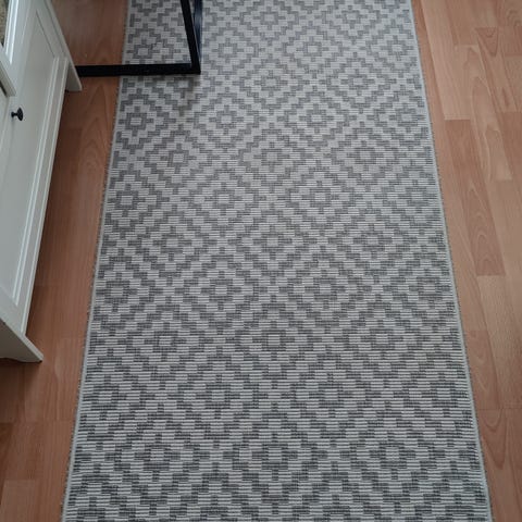 Harmaat matot, joissa valkoinen koristeellinen reunus. Matot soveltuvat käytettäväksi esimerkiksi käytävissä tai keittiössä.
