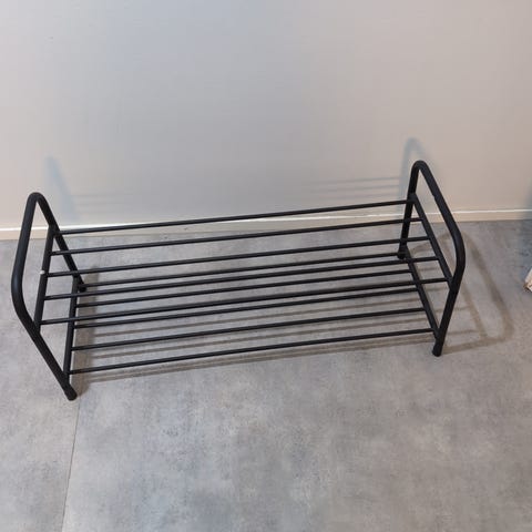 Jyskin musta kenkähyllykkö. Tässä niitä on kaksi päällekkäin ja tätä on tuunattu 60cm leveäksi.
