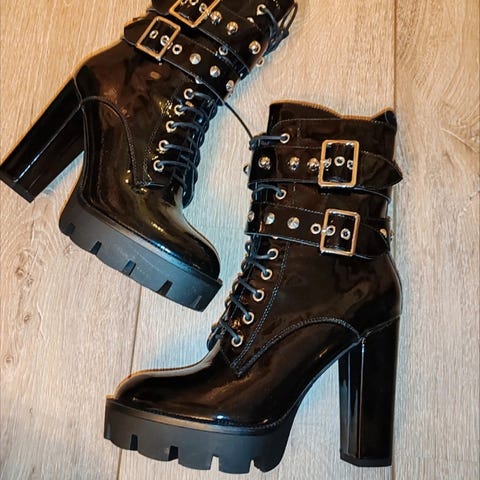 Todella rohkeat keinonahkasaappaat, koko 42. Merkki Cink Me. Korko noin 11,5cm.
