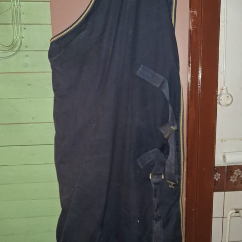 Tummansininen 155cm ehjä toppaloimi paksukaulaiselle hevoselle. Käytetty suomenhevosella, jolla aika massiivinen kaula. Merkitön, mutta yksi parhaiten istuvista loimistani kyseisellä hevosella. Ehjä, muttei pesty eli karvat kuuluu kauppaan. Ehjä musta vuori. Paksuutta en löytänyt, mutta arviolta 300g.