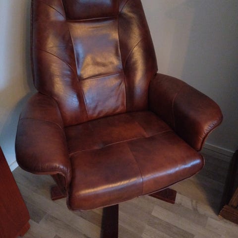 Musta, nahkatuoli pyörintämekanismi ja siihen kuuluvä nahkainen rahi.