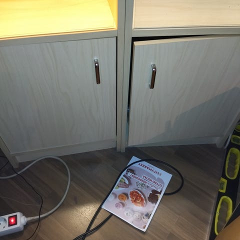 Kaappi, jossa yläosassa lasiovi ja välillä avohyllyt plus laatikko sekä alhaalla umpiovikaappi. Materiaali puuta