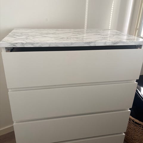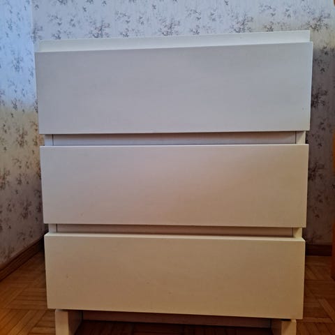 Valkoinen Muuramen lipasto vanhempaa leveämpää mallia kolmella vetolaatikolla.