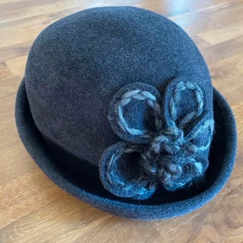 Materiaalista ei ole täysin 100% varmuutta, koska hattu on tehty käsin. Luultavimmin se on kuitenkin villahattu. Ympärysmitta sisältä on noin 58cm. Ulkopuolella kukkakoriste.