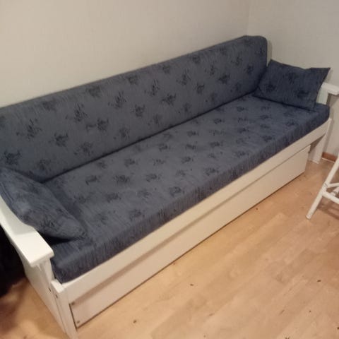 Tarjolla täyspuinen, pyörillä ja sälepohjalla varustettu, tummanruskeaksi petsattu vuodevaatelaatikko. Toimii vaikka kätevänä sängyn alta vedettävänä pienemmän ihmisen varavuoteena.