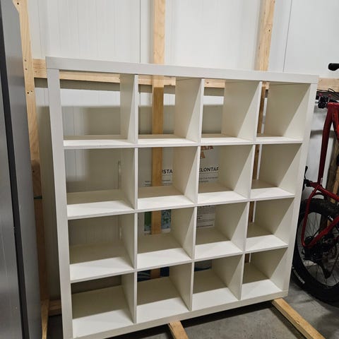 Hyväkuntoinen IKEAn Kallax hylly. Pidetty aina vaakatasossa, joten toisella pitkällä sivulla on huopatassut alla.