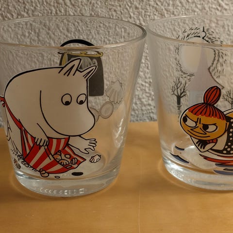 Muoviset Muumi-juomamukit näteillä pidikkeillä. Upouudet, nouto Vallilasta. Ei käsittääkseni saa Suomesta. 17€/2kpl, 10€/1kpl.