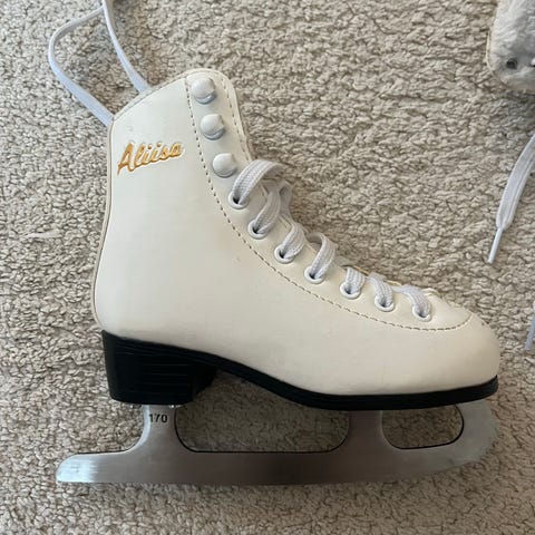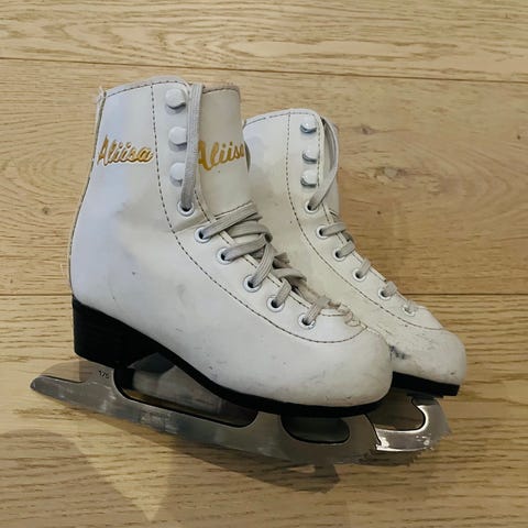 Muutaman kerran käytetyt Aliisa-merkkiset luistimet. Ehjät ja erinomaisessa kunnossa, lukuunottamatta paria pintanaarmua, jotka kuvassa.