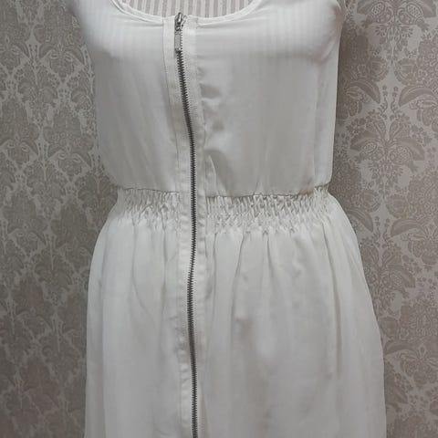 Kaunis mekko, takana kivat selkäosan leikkaukset, polyesteriä 56%, puuvillaa 41 % ja elastaani 3 %. Pukemista helpottaa vasemmassa sivussa oleva vetoketju.