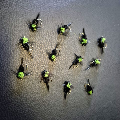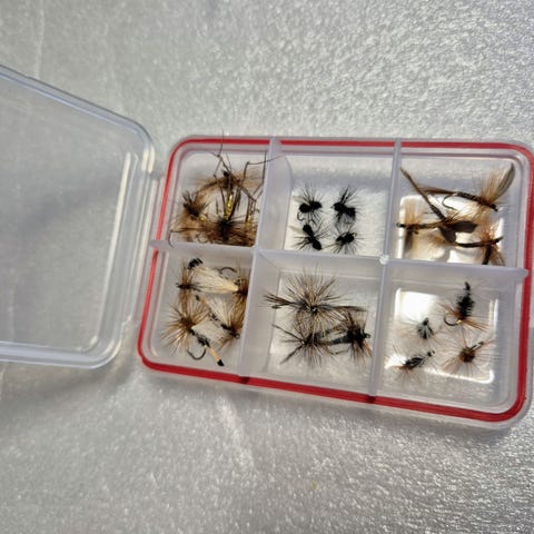Toimiva ja pyytäväksi todettu Elk hair caddis-malli, muita ei tarvitse. Osa tehty cdc-höyhenistä, osa on tumman sävyisiä, ja osa vaaleita. Näillä pärjää niin Lapissa kuin myös Keski-Suomen reittivesillä. Hintapyyntö 55€ + mahdolliset postikulut. Rasia kuuluu kauppaan.