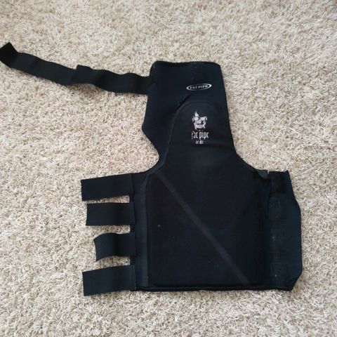 Paljon käytetyt polvisuojat, kulumaa korjattu erkkarilla toisesta suojasta. Tarrat toimii. Koko M/L.