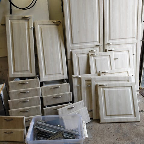 2 kpl 70,5x50x30.5 seinäkaappeja. Näissä on ovet mutta kaapit itsessään ottanu aika paljon damagee, osaava kaveri saa kyllä kursittua kokoon