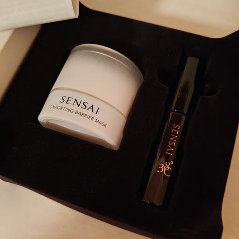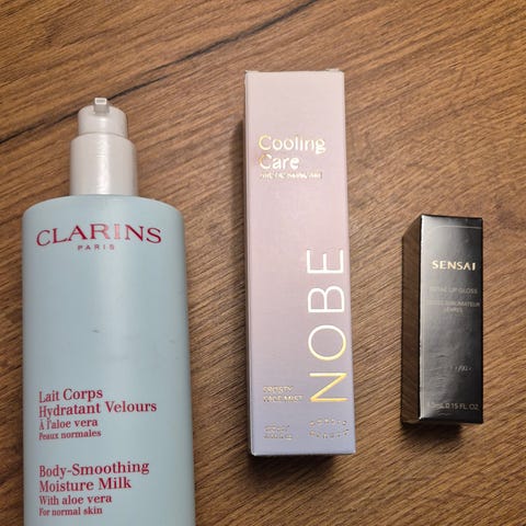 Sensain paketti jossa kokeilukokoisia tuotteita. Kasvojenpesugeeli 75ml. Kasvovoide suojakertoimella 8ml. Huultenympärysvoide 5ml ja pieni huulikiilto.