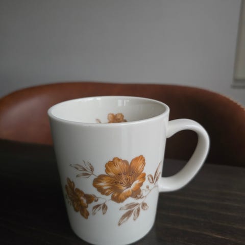 Arabia kukkakuvioinen muki, jossa on ruskean sävyinen kukkakuvio. Muki soveltuu esimerkiksi kahvin tai teen nauttimiseen.