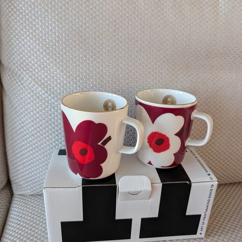 Marimekko Juhla Unikko kahvimukin vuodelta 2024.Nämä voidaan myös postittaa hyvin pakattuna kuluja vastaan.