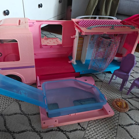 Jo parhaat päivänsä nähnyt Barbie dream camper matkailuauto. Autossa mm. kaksi irto tuolia, uima-allas, riippumatto. Tarrat osin repsottaa ja lähteneet ja auton aukaisu/kiinnitysmekanismit hieman ränkkänät, täytyy käyttää hieman voimaa että saa laitettua kiinni. Jos nämä eivät haittaa niin hyvin käy vielä Barbie leikkeihin. Lisäksi Barbie hevonen ja talli. Tässäkin muoviosissa käytönjälkiä ja vaaleanpunaisen oven alaosan muovi rikki. Ei tietoa onko kaikki ovet yms. tallella.