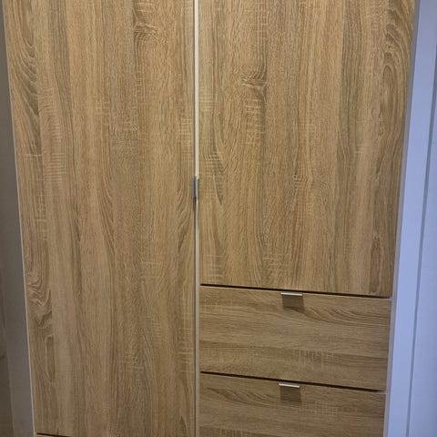 Muuton alta pois JYSKin vaatekaappi. Oikeaan sivuun ruuvattuna vaatekoukku. Kaappi tyhjätään roinasta ennen noutoa.