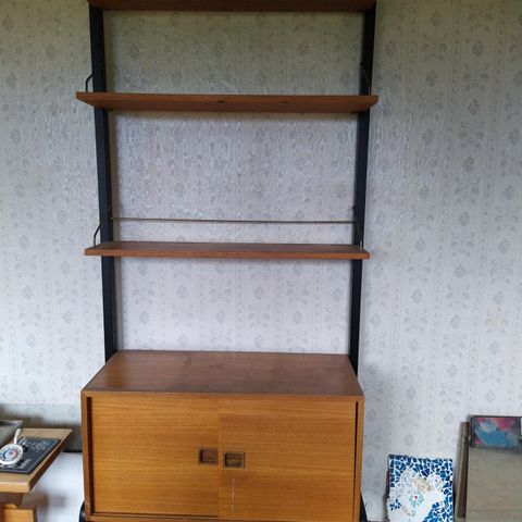 Ehjä ja siistikuntoinen teak kirjahylly. Alakaappissa molempiin suuntiin aukeavat liukuovet ja hyvin säilytystilaa.