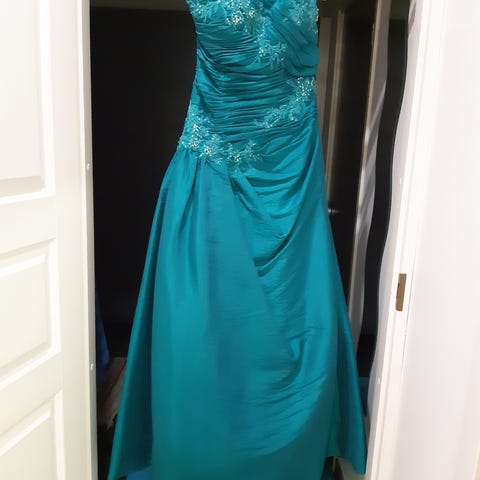 Kerran käytetty iltapuku hääpukuna. Sopii myös esim. vanhojen tansseihin. Koko M/L, nyöreillä saa säädettyä kokoa selkäpuolelta melko reilusti. Tyllikerros sisäpuolella. Musta olkahuivi kuuluu pakettiin.