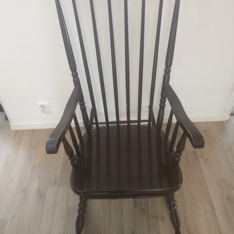 Hyväkuntoinen tummanruskea keinutuoli