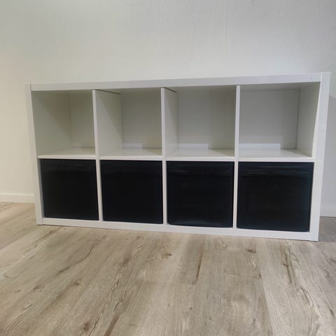 Ikean 4x4-lokeroinen musta Kallax hylly. Toiseksi alimmissa lokeroissa lasihyllyt, jotka saa irti, samoin kaapit mahdollista irrottaa lokeroista. Huom. kasatessa liitoksia liimattu, joten kuljetusta varten ei ole mahdollista purkaa, nätisti tuota on kuitenkin saatu muutettua.