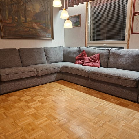 Harmaa kulmasohva.