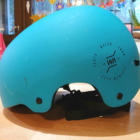 Sininen luistelukypärä, jossa mustat kiinnikkeet ja reiät ilmanvaihtoa varten. Sopii pään suojaamiseen erilaisissa aktiviteeteissa.