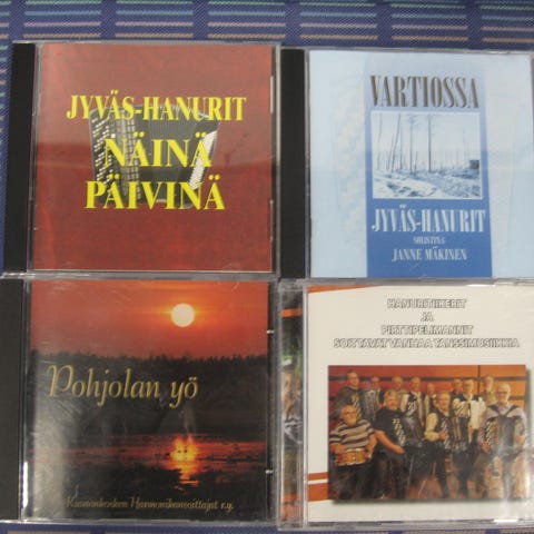 Myydään kotimaisia harmonikka cd-levyjä 3,00 euroa kappale. Kaikki cd:t kuunneltu ja todettu toimiviksi. Cd:ssä voi olla naarmuja & kansipapereissa jälkiä/omistuskirjoituksia, mutta cd-kotelot ovat ehjät. Postituskulut ostajalle ja noutokin sovittavissa.