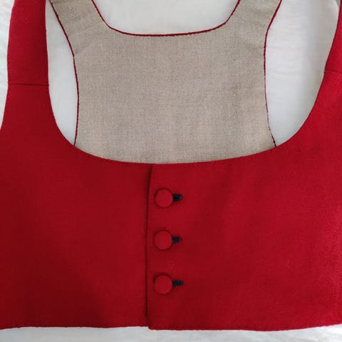 Helmi Vuorelan mallistoa,Liivihameen hameosa on pun-vihreä raitainen,punaisessa liiviosassa kirjailua.Paidan etuosa laskoksilla ja pitseillä,hihansuissa reikäommel.koko 36-38