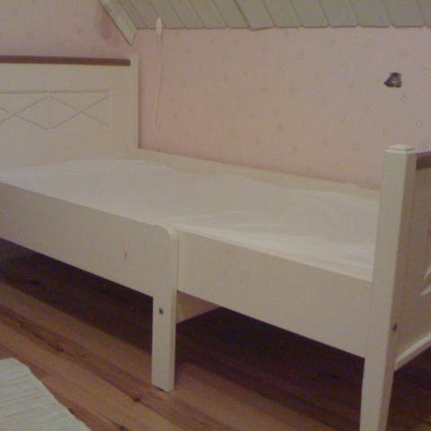 Tosi hyvässä kunnossa oleva lasten sänky. Sängyn ulkomitat 78x166cm ja siihen menevän patjan koko olisi 70x160cm (ei tule mukana). Sivulaidan saa vaihdettua myös sängyn toiselle puolelle.