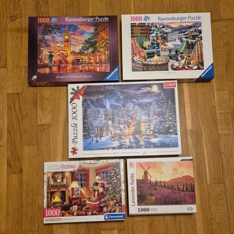 1000p palapelejä. Nouto Vantaa/Vallinoja. Nouto mahdollista myös HKI/Puistola. Käteis maksu. (ei MobilePay) Yksittäin ~5-7€/kpl
