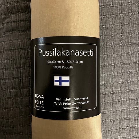 Erikoispitkä peitto ja siihen sopiva beige pussilakanasetti. Setti sisältää myös tyynyliinan. Molemmat uusia käyttämättömiä.