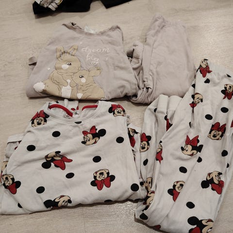 Shortsi pyjama, kahdet pyjamahousut ja yksi paita. Jälkimmäiset eivät ole samaa paria. Koot vaihtelee, mutta olleet samaan aikaan käytössä. Jonpaöjon käytettyjä, mutta ehjiä.