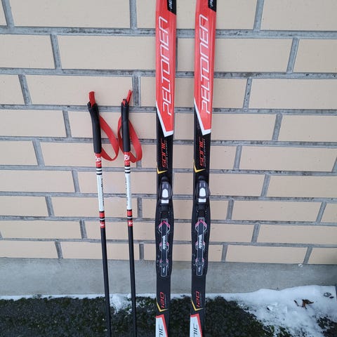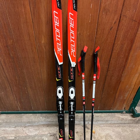 Päiväkoti- ja koulukäytössä olleet sukset ja sauvat (pituus 80 cm). Kulumia on, mutta toimivat lasten peruskäytössä vielä hyvin.