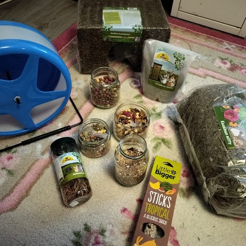 Tästä aloituspakkaus seuraavalle. Puiset mökit desinfioitu uunissa. Mukana mökkejä, juoksulautanen, herkkutanko, juoksupallo, wc-mökki, wc-hiekka ja laadukasta ruokaa sekä nakerteluun sopiva uusi ruohoputki. Kaupan päälle toisesta kuvasta löytyvä elämää nähnyt duna.