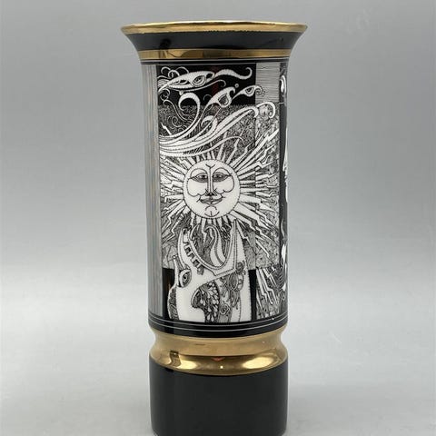 Posliini Maljakko, jossa on koristeellinen kuviointi ja kultaisia yksityiskohtia. Valmistaja on Hollóháza, Unkari. Art deco -tyylinen maljakko, joka edustaa 1900-luvun alun muotoilua. Tyylille on ominaista geometriset muodot ja ylelliset materiaalit.