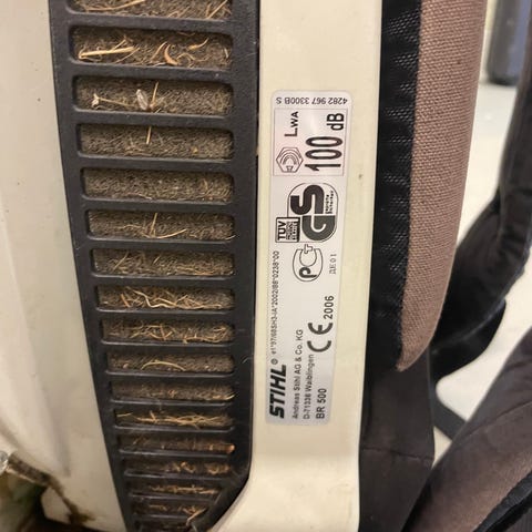Stihl BR 500 C-E selkäpuhallin, oranssi ja musta väri, moottorikäyttöinen. Soveltuu lehtien ja kevyiden roskien puhaltamiseen ulkona.