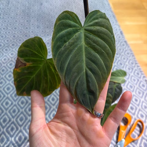 Myydään kuvien nukkaköynnös muoviruukussa! Huom. kasvi ei kukassa juuri nyt, mutta tuossa kuvassa näkyy parhaiten värit luonnonvalossa ja suloinen violetti kukka (kukki marraskuussa kasvilampun alla). Käsi ja sakset tuomassa mittakaavaa muissa kuvissa. Tuuhea ja hyvinvoiva kasvi, joka kasvattaa esim. kesällä valossa vielä paksumpaa vartta ja komean kokoista lehteä.
